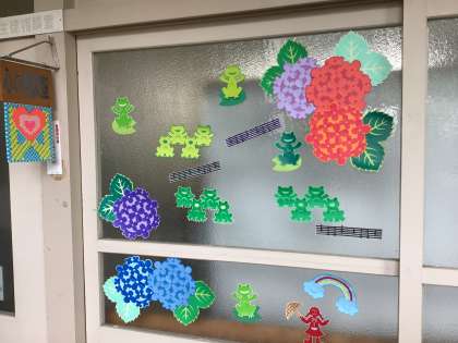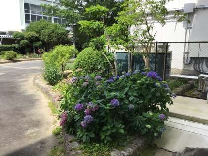 校内の紫陽花の花が満開です。掲示板にも紫陽花が飾られています。