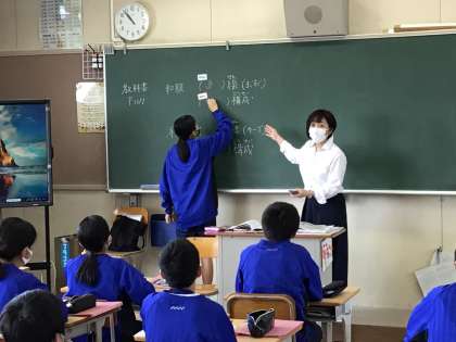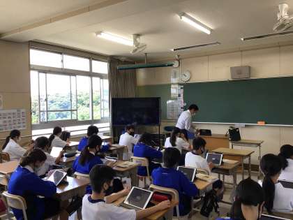 ユニバーサル授業を意識して、タブレットの活用場面、板書、発言の場を考えています。