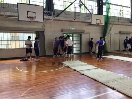 マット運動の技を完成させるために互いに教え合います。