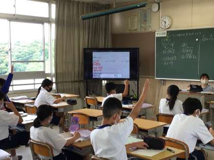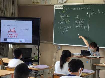 タブレットと電子黒板で、意見を共有しています。