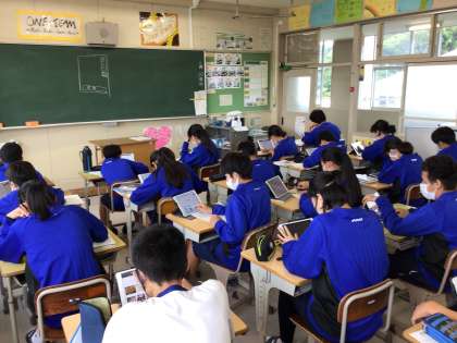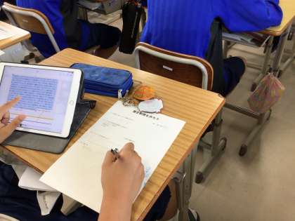 社会科では、タブレットで調べたことをまとめています。