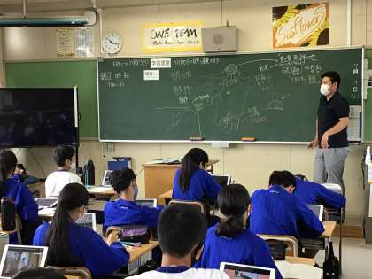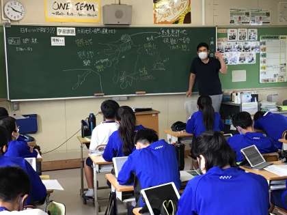 社会科の授業の様子です。タブレットで調べながら考えをまとめています。