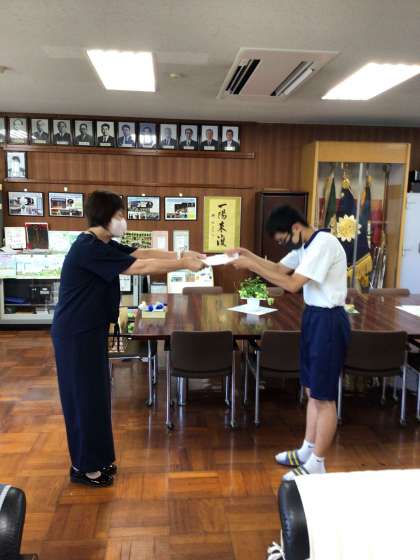 校長室で、校長特別賞を渡しました。登校中、自転車で転倒した生徒の自転車を引いて来てくれました。このような、やさしい気持ちをもった生徒がさらに増えていくことを期待しています。