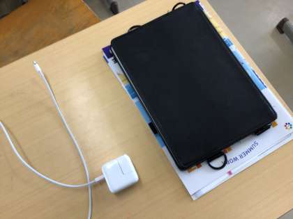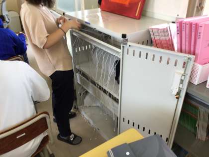 夏休みの生活について話を聞いています。タブレットも持ち帰りです。