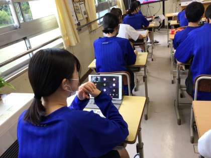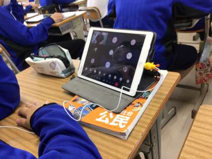 話し合い活動ができないので、イヤホンを使って意見交換をしています。