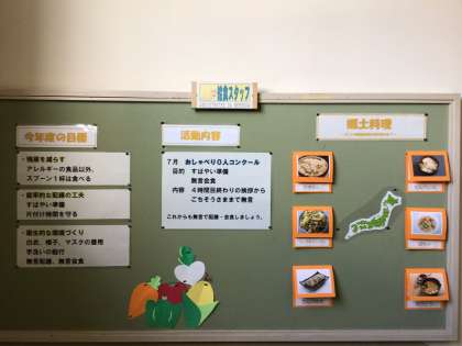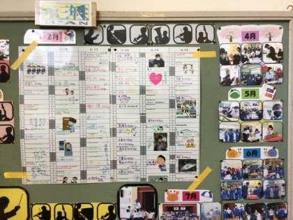 校内の掲示板には、行事予定や情報が楽しく示されています。