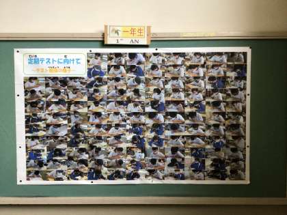 1年生のテスト勉強の様子が掲示されています。真剣な顔は輝いています。