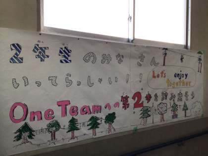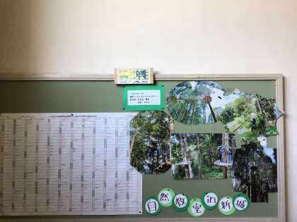 今日は、2年生が新城総合公園に自然教室に行きます。3年生からの励ましのメッセージが掲示されています。