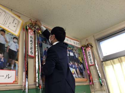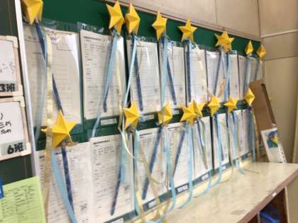 学級に体育祭の振り返りや学級写真が掲示されています。