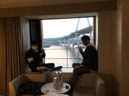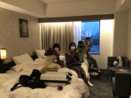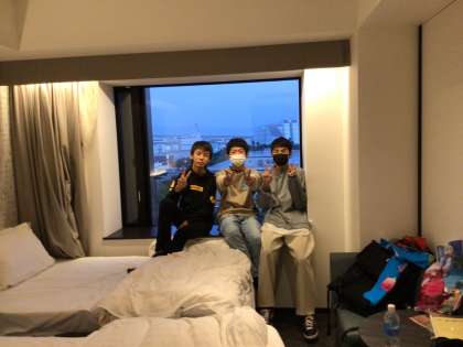 おはようございます。ホテルの部屋です。朝食前です。全員元気です。