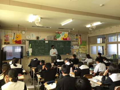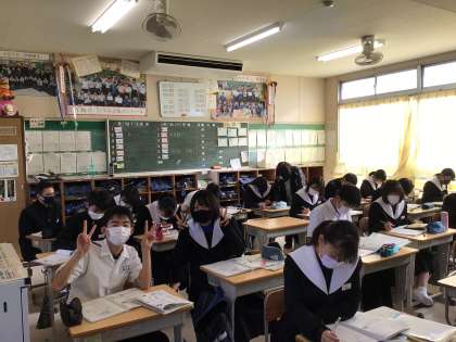 社会科の授業です。企業と労働について学習しています。授業を参観しているとカメラに目を向けてくれます。集中力が途切れないように気をつけてまわります。