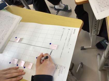国語の授業では、心情曲線を使って読み取っています。