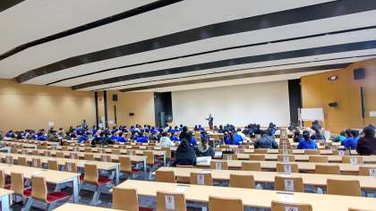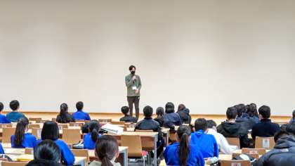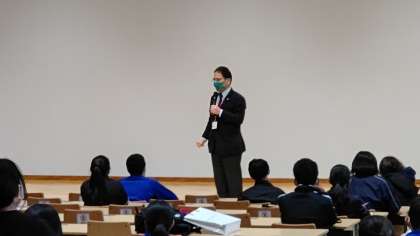 中京大学キャンパス内の見学を終えて、講堂で学習のまとめをしています。