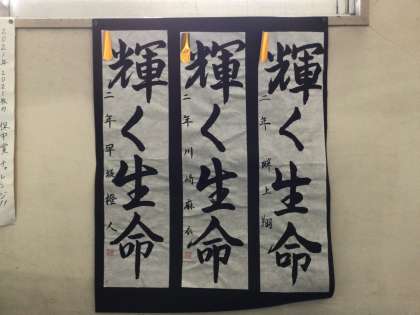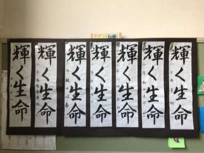 2年生の書き初め作品が掲示されています。