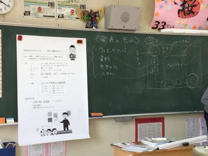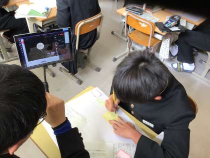 3年生の社会科で、「地球社会とわたしたち」というテーマで学習しています。リモートで話し合いをしています。
