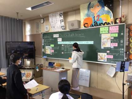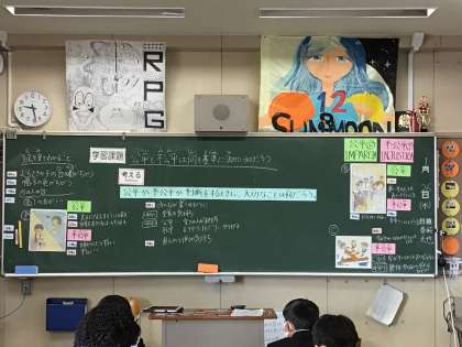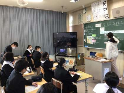 授業の中で、写真などを使って視覚化したり、難しいことばにはルビをつけ、発問で課題を共有化しています。生徒の考えを引き出します。