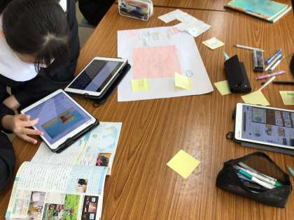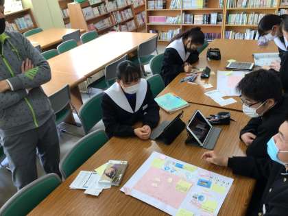 社会科の授業では、テーマを決めてポスターセッションの準備をしています。二言語又は三言語で発表します。