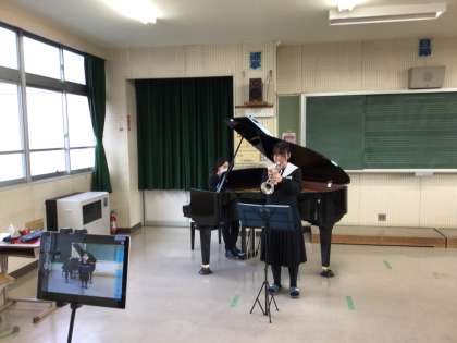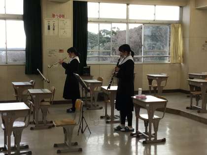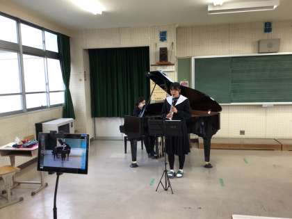 吹奏楽コンクールに2名の生徒が動画で参加します。生徒の撮影の様子です。
