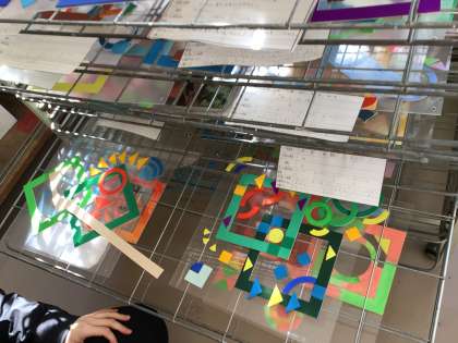 美術では、色の学習でシンメトリーやグラデーションを使って作品を作っています。