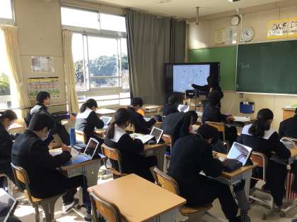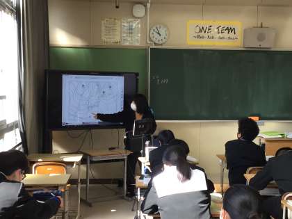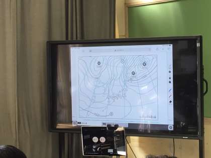 理科の授業はタブレットを使って等圧線を書いています。リモート授業で参加しています。