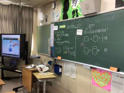 数学の授業です。球の体積について電子黒板を見ながら楽しそうに学習しています。