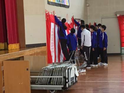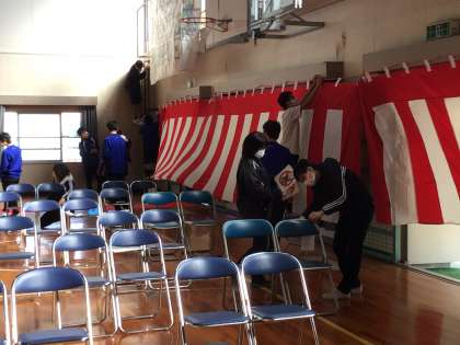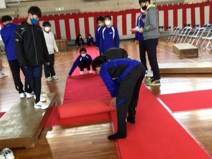 会場の紅白幕やカーペットを敷いて会場を作ります。