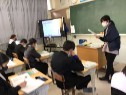 英語の授業です。リスニングテープを聞いて問題に答えます。