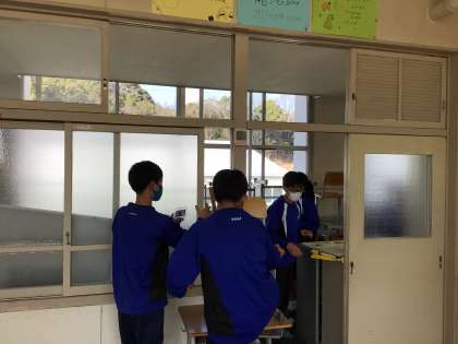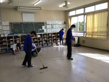 教室や廊下の掃除、掲示物の片付けをしています。