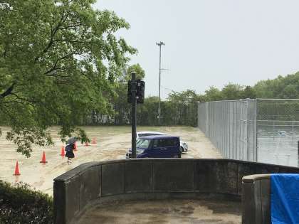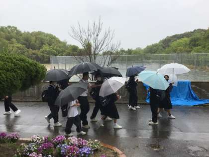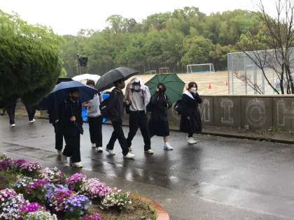 今日のような雨降りの日は、自転車通学の生徒の転倒による事故やケガに十分気をつけてください。下校時の車のお迎えは、グランドにお願いします。
