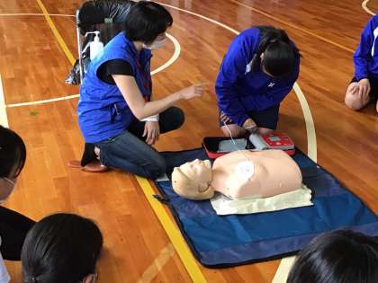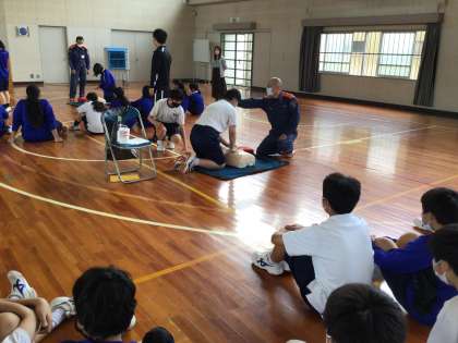 2年生が応急手当講習で、AEDの使い方について学習しています。