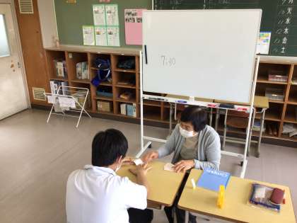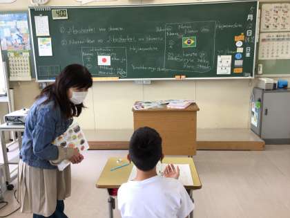 新しい生徒が登校しています。自己紹介するときの日本語を練習しています。