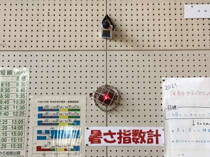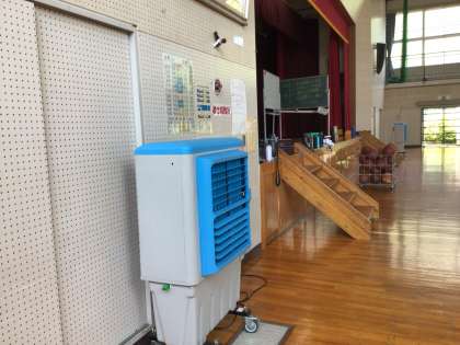 体育では、バスケットボールのシュートのテストをしています。体育館の暑さ対策もしっかり行っています。スポットクーラーも設置しています。