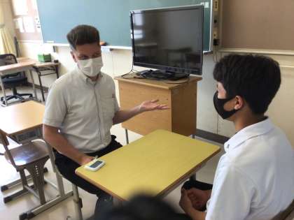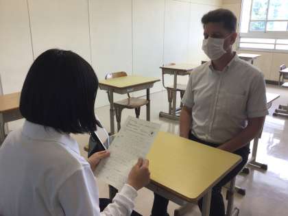英語ではALTの先生を相手に、海外旅行をテーマに会話をしています。