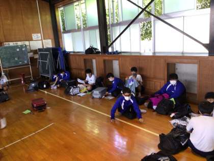 明日からの修学旅行に向けて荷物点検をしています。ワクワク感が伝わってきます。