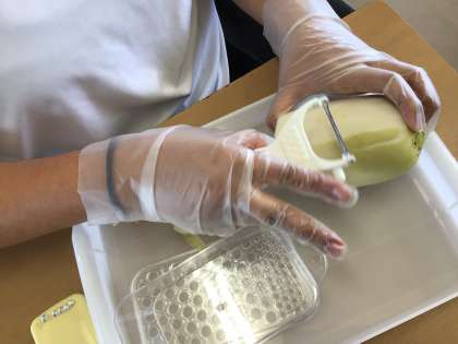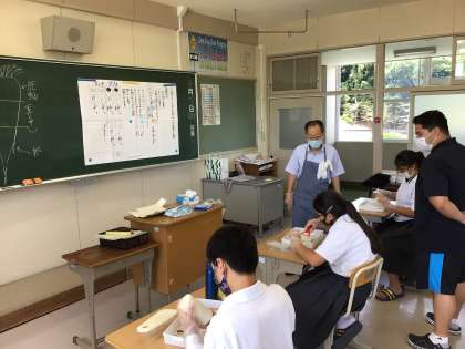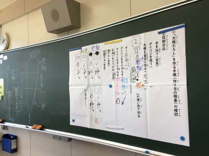 国語の授業で、大根おろしの作り方を実習しながら学習しています。