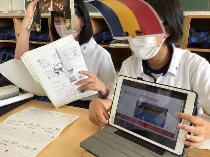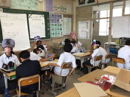 社会科で、「ワールドツアー」の発表をしています。