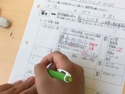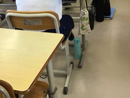 家庭科では、基礎食品群について学習しています。自席に水筒も置いています。