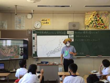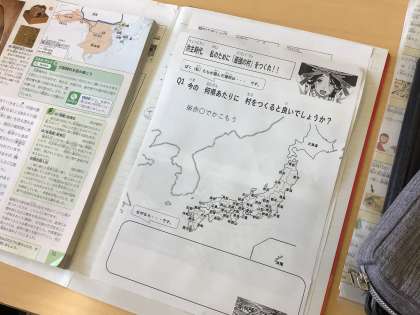 社会科では、弥生時代に最強の国を作るならどこかという学習課題についてペアで考えています。