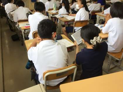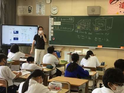 理科では物質の密度について学習しています。電子黒板やタブレットも活用して理解を促しています。