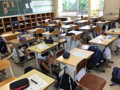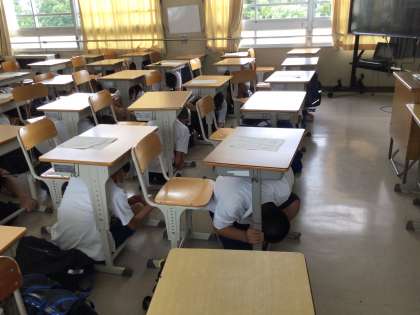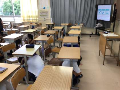 今日は、防災の日です。全校「あいちシェイクアウト訓練」に参加しています。