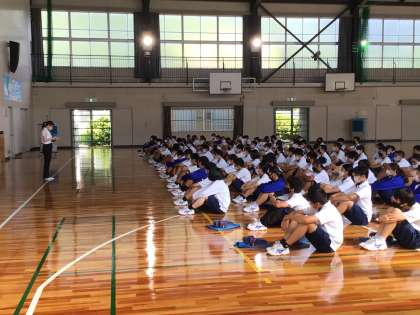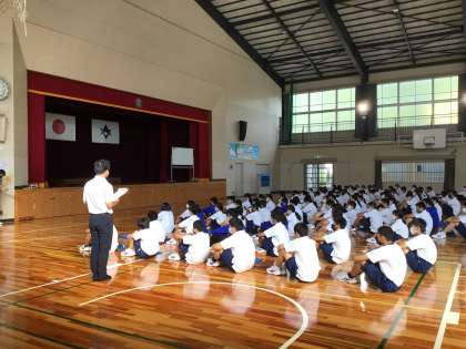 ドリルコンテストの結果表彰や学年行事についての話を聞いています。