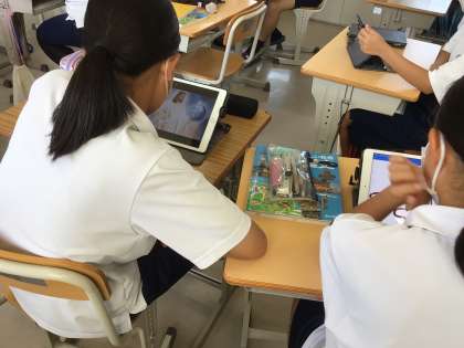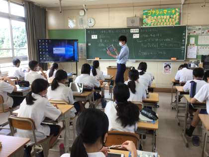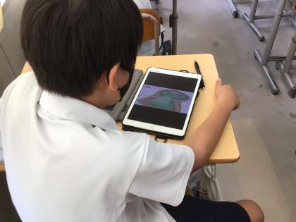 社会科では1年生の作った動画作品を見て、感想を伝える活動に取り組んでいます。