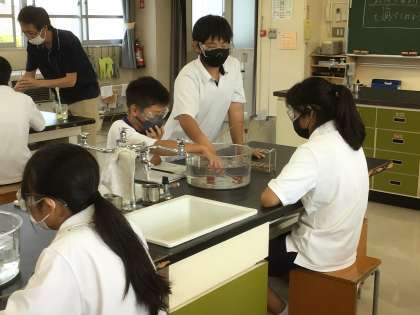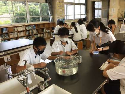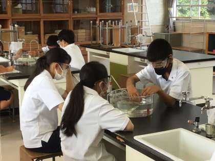 理科では気体を水上置換で集める実験をしています。大学から実習に来ている先生も参加しています。