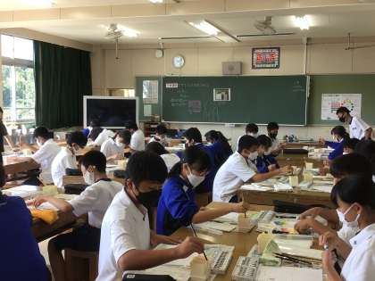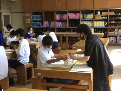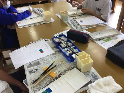 美術ではデザインセットの使い方を確認し、はみ出さないように、濃さが一定になるように塗る練習をしています。