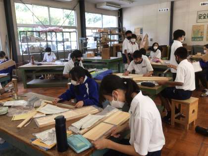 技術では本棚作りを行っています。慎重に寸法を測っています。