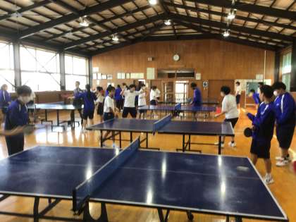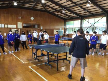 体育では卓球をしています。教師の模範を参考に強い球を打ち込んでいます。