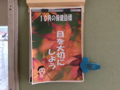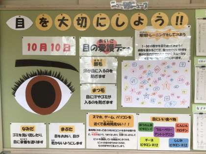 保健室前の掲示板です。10月の保健目標「目を大切にしよう」について掲示しています。