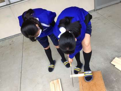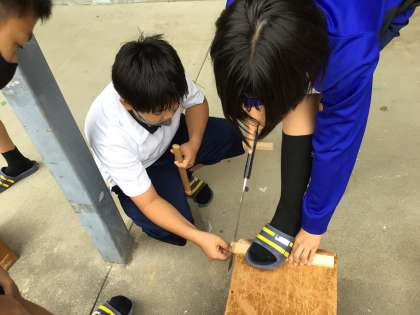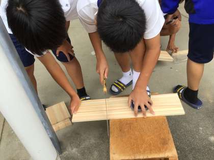 のこぎりの作業は、仲間からのアドバイスを受けたりサポートしたりして作業を進めます。