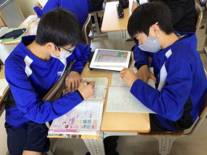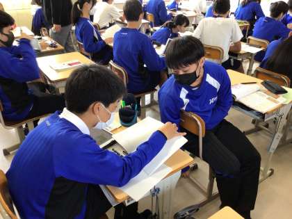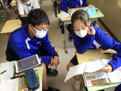 社会科では、席の近い生徒同士で自分の考えを伝え合っています。