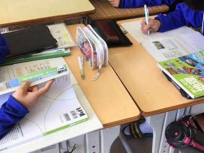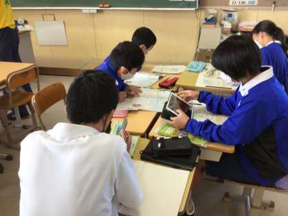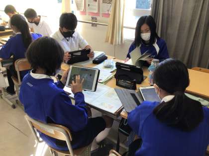 社会科では資料をもとにアジアが成長した理由について、グループで話し合っています。